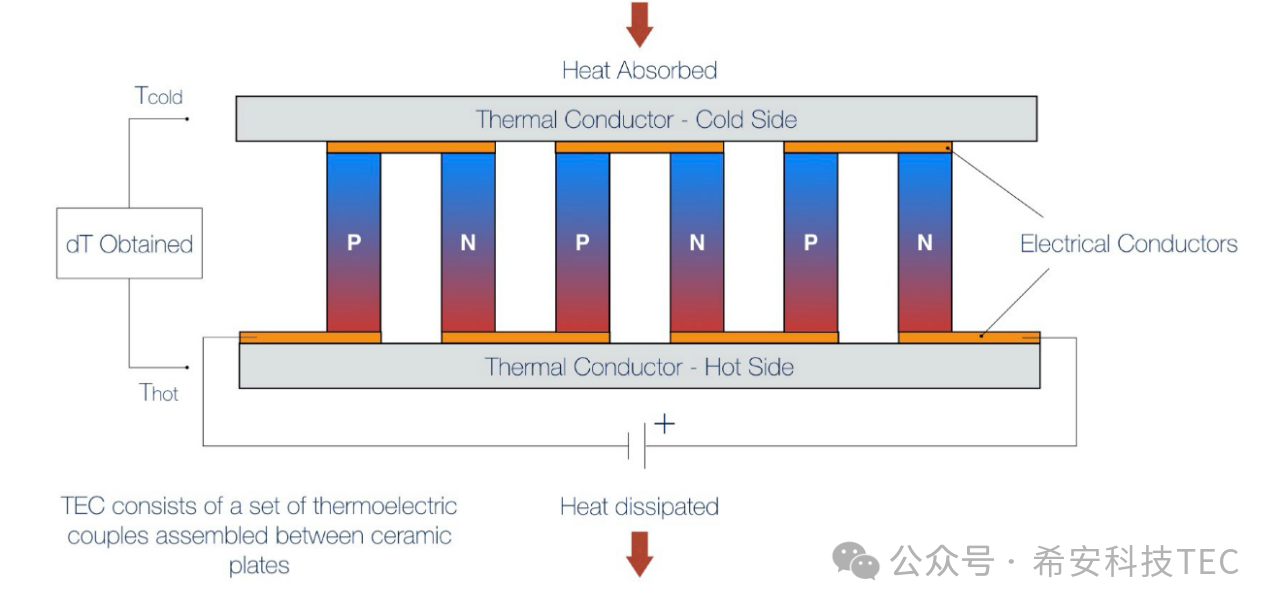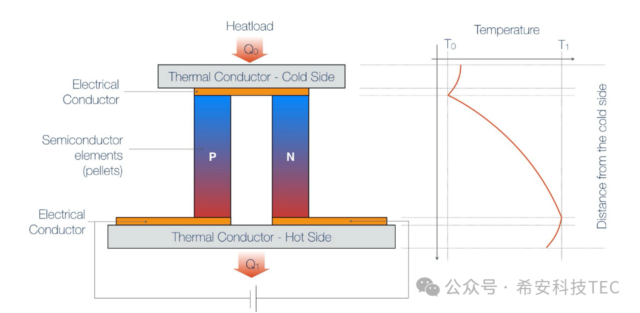 खालील आकृतीत दर्शविल्याप्रमाणे थर्मोकूपलच्या दोन्ही टोकांना थर्मल कंडक्टर जोडले जातात: एक संपूर्ण TEC तयार होतो. जेव्हा TEC पॉवर केले जाते, तेव्हा वरचा पृष्ठभाग उष्णता शोषून घेतो, ज्याला कोल्ड एंड म्हणतात आणि शोषलेली उष्णता Q0 असते. खालचा पृष्ठभाग उष्णता सोडतो आणि त्याला गरम पृष्ठभाग म्हणतात, उष्णता सोडली जाते Q1 ; Q1= Q0+Qtec